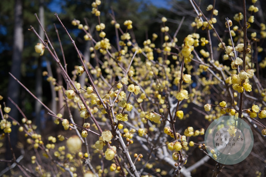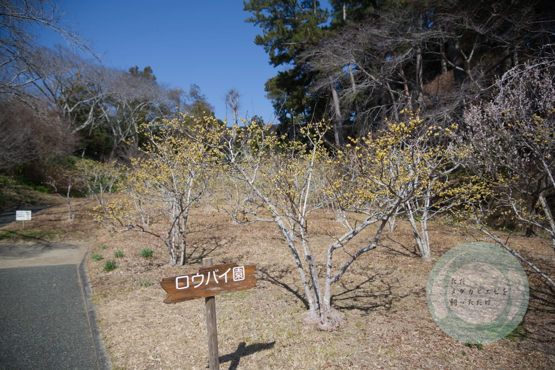 ロウバイ園ではちょうど「蝋梅」が見頃を迎えていて、水仙に近い甘い香りがふわっと漂っていました。