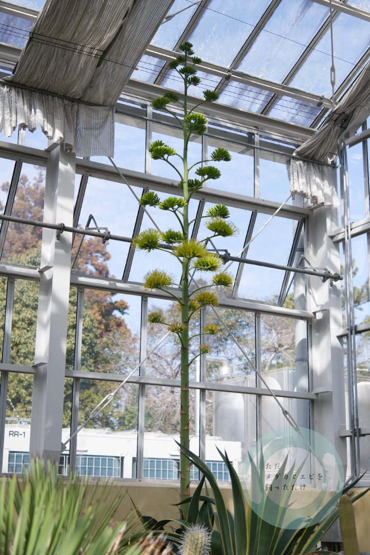 温室では、一つの株から一生に一度しか花を咲かせない「アガベ」が開花中でした。